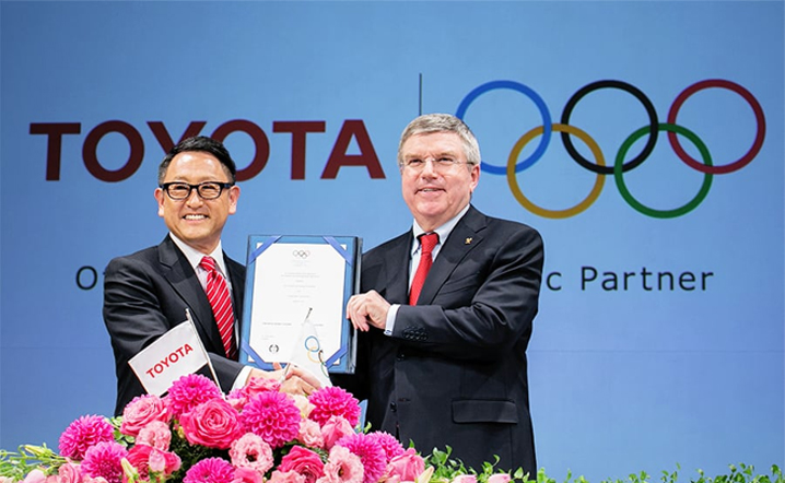 丰田在FIFA世界杯赞助商结束后第二年的2015年与国际奥委会、国际残奥委员会签订了全球合作伙伴协议。作为第一个汽车企业的合作伙伴,从2017年的平昌赛会到2024年的巴黎赛会,共计已经与4个赛会签约,丰田将长期持续支持全球性体育盛典。目前,丰田有橄榄球、硬式棒球、长距离田径、女子篮球、女子垒球、滑冰、沙滩排球等强项目运动队7个,以及27个队+1个团体的一般项目运动队。还有像足球J联盟的名古屋鲸鱼八和男子篮球B联盟的阿尔巴克东京那样的专业化队,此外还雇佣了在职业余运动员、残疾运动员的个人竞技、团体竞技等从业人员,其中很多选手活跃在奥运会、残奥会等各种国际大赛中,并创造出了优异成绩,而且有不少著名选手后来担任了企业中的重要职位。丰田员工佐藤圭太、芦田创两名选手在2016年的里约残奥会中获得了男子400米接力赛铜牌。 丰田公司在成为国际奥委会和IPC全球合作伙伴之后首次迎来的2018年平昌冬奥会中,对来自20个国家的50余名选手作为“丰田团队队员”给予了支援,其中兼职运动员宇野昌磨在男子花样滑冰项目中获得了银牌。