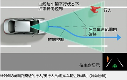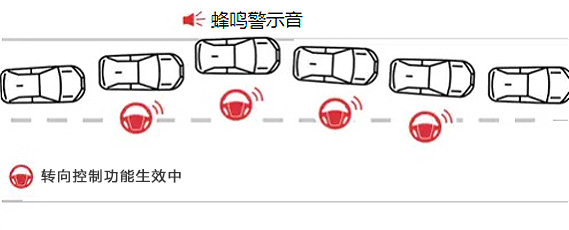 通过蜂鸣声和仪表盘显示作出提示,同时转向控制功能启动,辅助方向盘操作,避免越过白(黄)线。