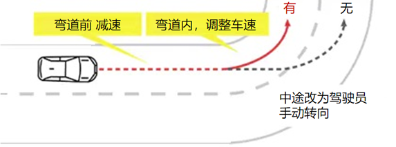 使用雷达巡航控制系统行驶过程中,当遇到弯道系统判断需要介入时,在开始转向时启动车速控制功能,同时在多功能信息显示屏上提示驾驶员系统正在动作。