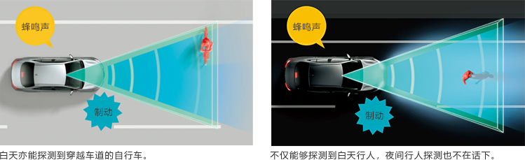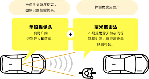 借助毫米波雷达和单眼摄像头,探测前方车辆和行人(昼夜)、骑行者(昼夜)、二轮机动车(昼间)。
