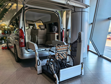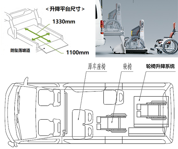 ·车后掀背开门,搭载TAMI升降平台,轮椅可直接进入车内,车内配有轮椅固定装置。升降平台伸出车外长度1850㎜,宽度1385㎜,车内高度1520㎜