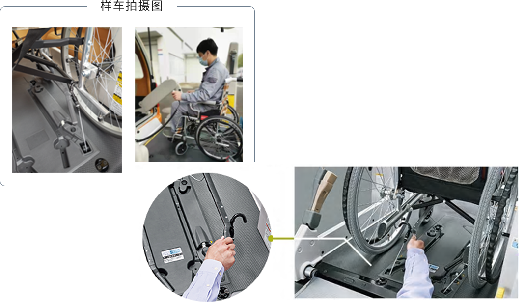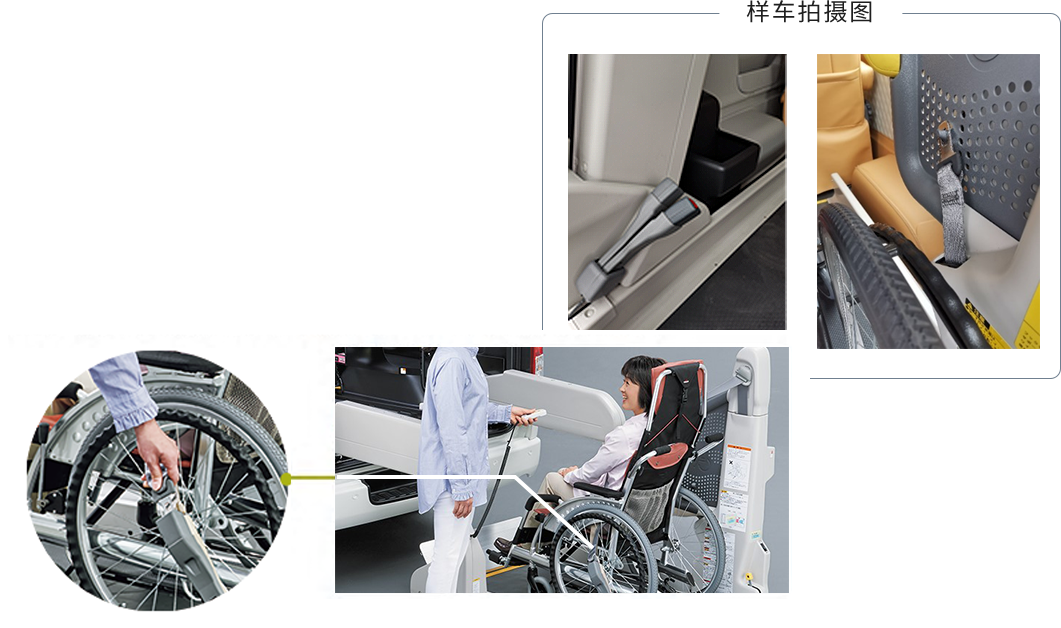 利用2个固定索从后方4个位置牢牢固定轮椅。固定完成后还会有提示音(根据不同车型可能会没有此功能)