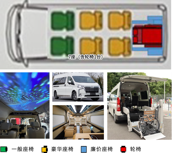 ·7座(含驾驶位),正常座椅5个,轮椅位2个,可根据需求进行样式改装