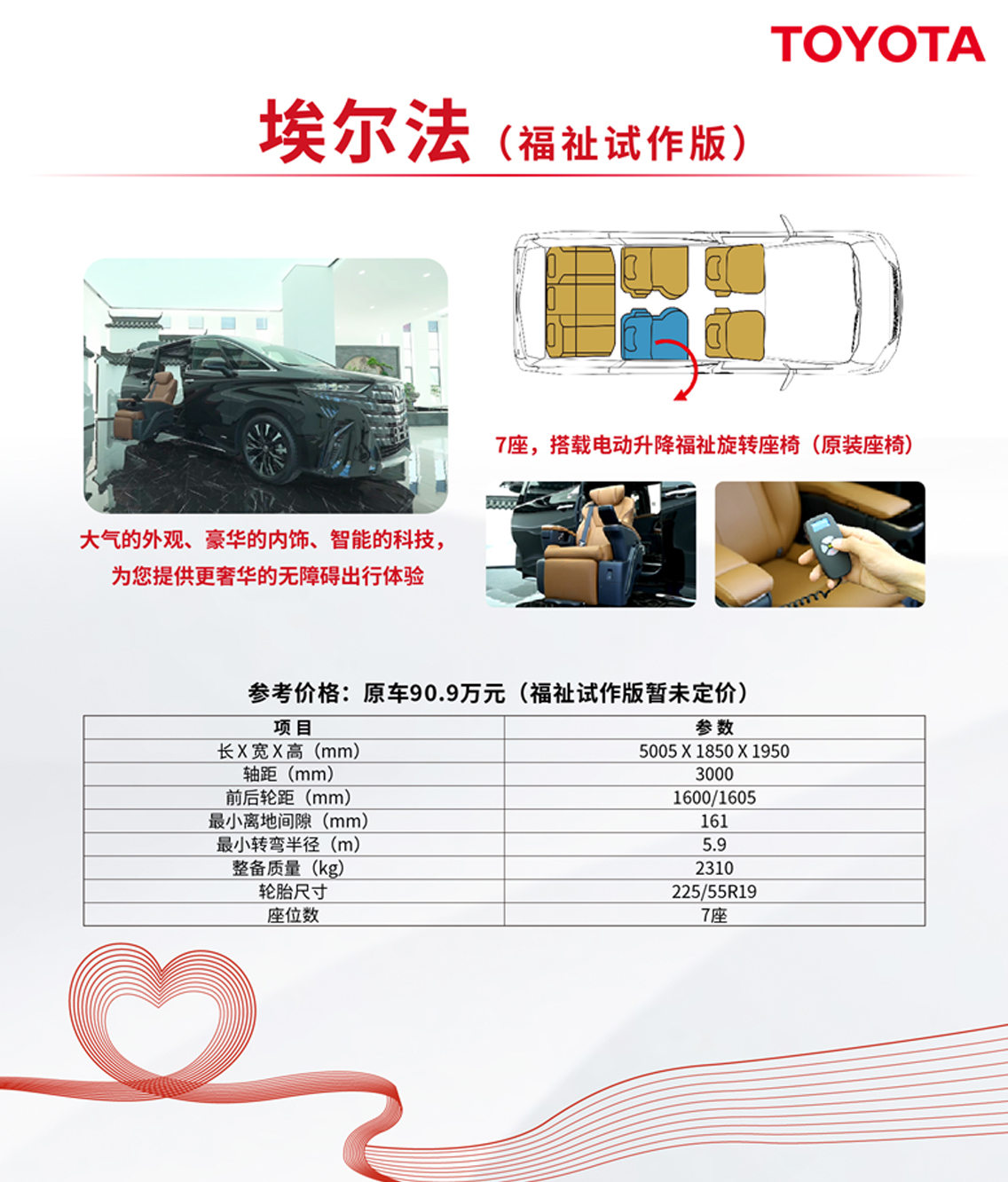 ·电驱动,可将座椅旋转出车外并降低390mm,方便有需要人群上下车。