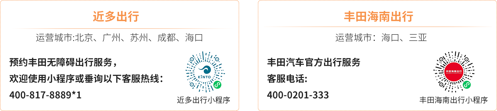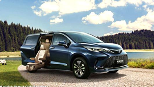 丰田中国与丰田金融服务及其全资子公司近多出行于2024年5月28日, 联合推出丰田福祉车(无障碍车)租赁及约车服务,旨在为行动不便人士提供更加便捷舒适且安全的无障碍出行服务。 服务目前提供的车型为赛那福祉版、格瑞维亚福祉版等,今后也将根据不同群体、不同需求,推出更多样的车型及服务方案。 此服务已在北京、广州、苏州、成都和海口全面启动,今后也将陆续扩展到其他省市。 2025年2月起,丰田海南出行在海南岛也推出了福祉车(无障碍车)租赁以及约车服务。