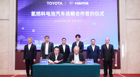 (2023年3月24日,海口)丰田汽车(中国)投资有限公司(以下简称“丰田中国”)与海马汽车股份有限公司(以下简称“海马汽车”)签署战略合作框架协议,将在氢燃料电池汽车(以下简称FCEV)研发与产业化领域开展战略合作。丰田中国董事长上田达郎、海马汽车董事长景柱等人出席了签约仪式。