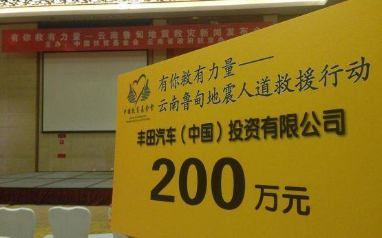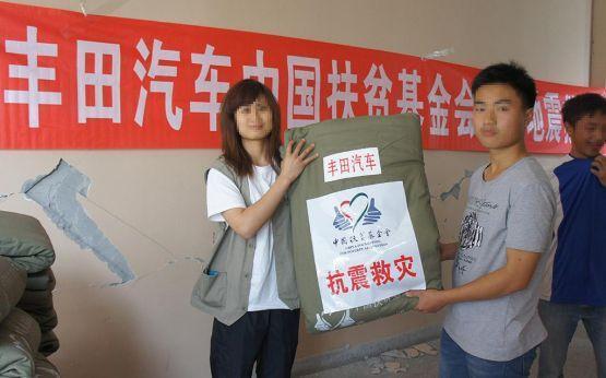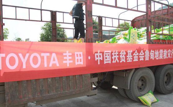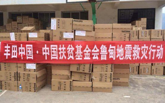 2014年8月3日,云南省昭通市鲁甸县发生6.5级地震。丰田中国联合一汽丰田、广汽丰田向灾区捐助800万元(含2辆价值66万元的救灾车辆)。丰田中国与中国扶贫基金会合作,把一部分捐赠金用于购买粮油、帐篷、电饭煲、电磁炉等救援物资,并积极投身援建卫生站、修建桥梁等灾后重建工作。