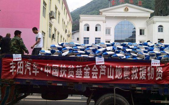 2013年4月20日,四川省雅安市芦山县发生7.0级地震。丰田及其在中国合资企业向灾区捐助1,000万元。此外,丰田的日本及在中国员工共捐款100多万元。丰田中国联合中国扶贫基金会,迅速将捐助的粮油、帐篷、棉被、紧急救援包等物资送往灾区。