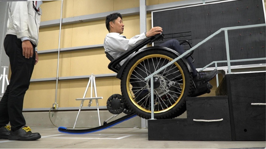 这款电动轮椅的后部安装了一个具有自动抑控功能的脚撑,可支撑轮椅保持平衡,实现了上下楼梯和在凹凸路面上的无障碍行驶。展会参观者在看到这款产品时兴奋地表示:“坐轮椅一般遇到台阶,就要绕远路”、“我总想着要是能爬上台阶就好了,真的很期待这款轮椅的问世”。