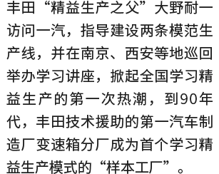 1981年,丰田生产方式(TPS)之父大野耐一访问一汽集团,协助建设了两条模范生产线,并在全国多地举办讲座,掀起了第一波学习TPS的热潮。随着丰田在华合作铺开,TPS的理念被不断学习推广,对丰田和中国车企的共同发展产生了积极和深远的影响。