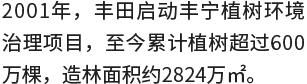 造车先植树,丰田从2001年开始针对周边尘源“丰宁县”进行了长达20多年的植树造林工作,累计植树超600万棵,相当于绿化了1.3条京广高速。