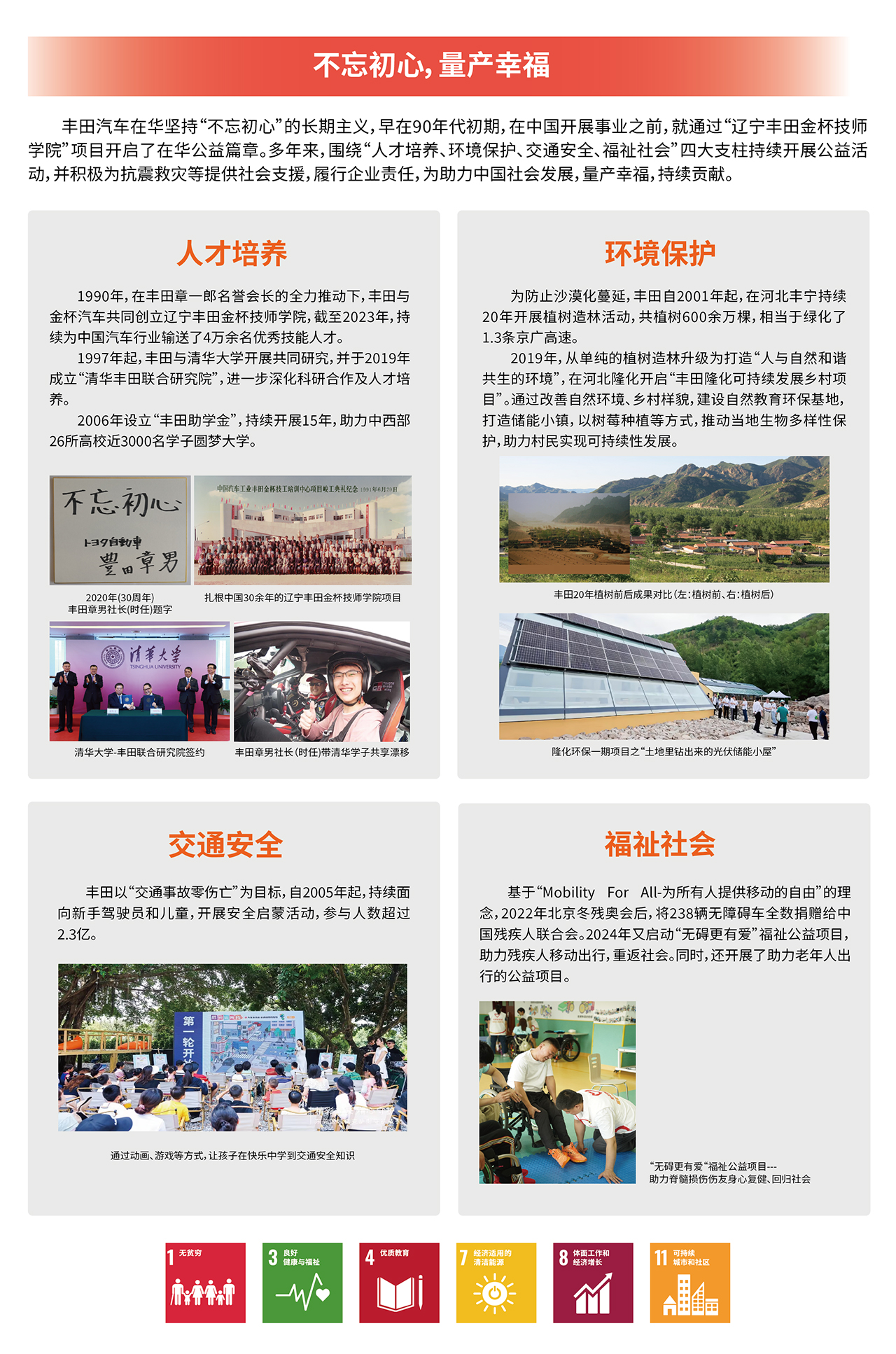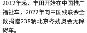 丰田秉承“为所有人提供移动自由”,致力助力中国无障碍环境建设。2022年,丰田为北京冬奥会和冬残奥提供了238台无障碍赛事用车,并于同年6月全数捐赠给全国215家残疾人服务机构,助力无障碍出行。2024年,丰田先后在全国5座城市推出“无障碍车租赁以及约车服务”,为移动不便人群提供更舒适便捷的出行方案。为了实现所有人的心之所向,行之所往,我们步履不停
