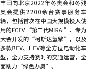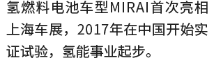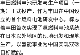 基于MIRAI燃料电池技术不断扩大氢能应用场景:2024年,丰田燃料电池研发与生产专用工厂投产,加速推出符合中国市场需求的产品。丰田始终以开放共赢的态度,携手“产、学、研”各个领域的中国伙伴,推动中国氢能技术创新和产业发展,助力实现碳达峰及碳中和的目标。
