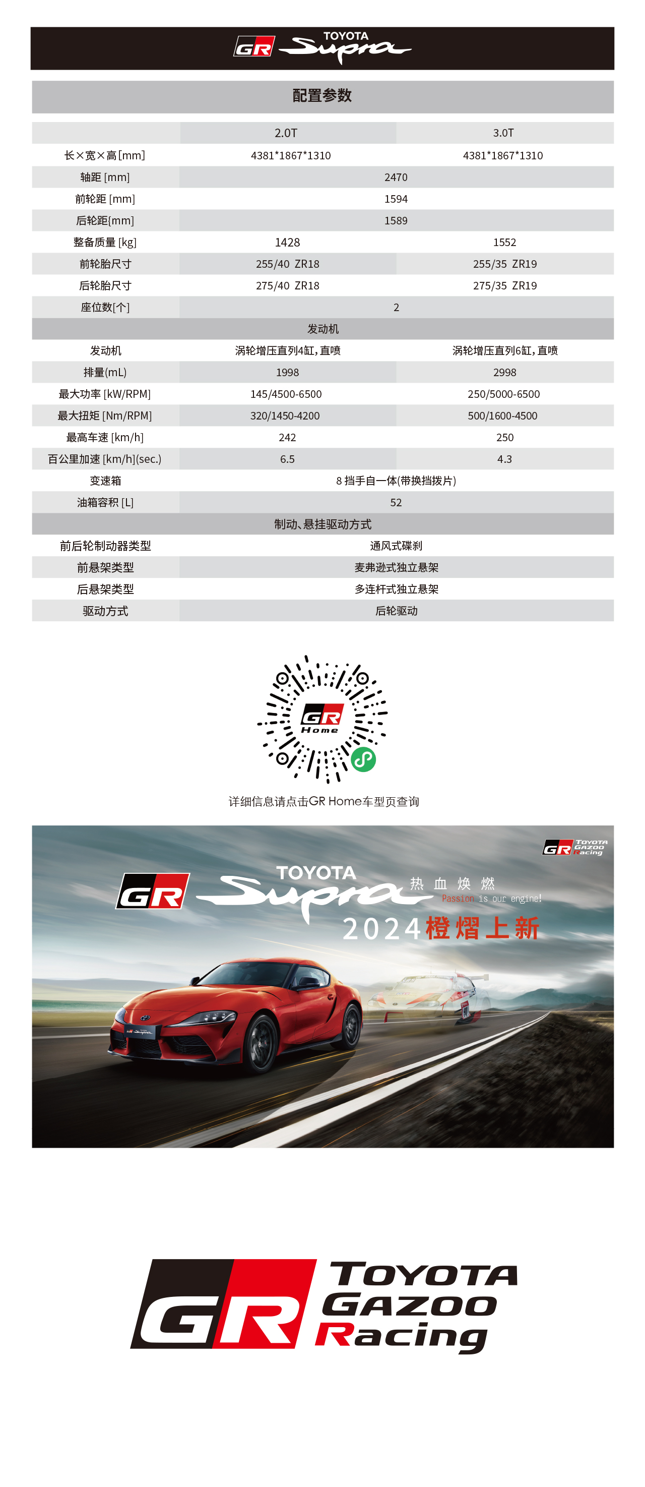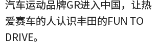 2020年,丰田旗下高性能运动品牌“GAZOO Racing”进入中国。秉承Morizo(丰田章男会长参赛名)“以汽车运动为起点,制造更好的汽车”的理念,GR希望通过专属车型为中国车迷带来驾驶乐趣,同时期待与大家共同推进中国汽车运动发展。让我们一起FUN TO DRIVE!
