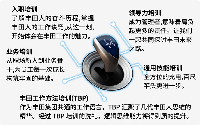 作为职场OJD的补充,我们也致力于完善培训体系,为员工提供多样化而有针对性的培训,即Off-JT ( Off-JobTraining )。为了培养能够在工作中践行“丰田之路”的人才提供保障。