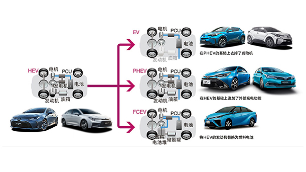 PHEV、EV及FCEV等新一代环保车中,混合动力技术也是关键。也就是说,混合动力技术可以涵盖所有应用于环保车开发的要素技术,和各种结构单元组合。 在丰田,"电机""电池""动力控制单元(PCU)"这3项技术被称为"电动化核心技术"。丰田把"电动化核心技术"定位为21世纪的环保核心技术,并不断加以改进。通过将固有单元添加到"电动化核心技术"中,使HEV、PHEV、EV、FCEV等各种新一代环保车的诞生成为可能。