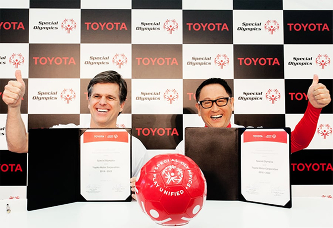 丰田认为,体育运动缩短了人与人之间的距离,它绝不只是以竞争为目的。丰田积极参与各国特殊奥运会*(以下简称SO)的赛事,2017年成为其“全球合作伙伴”。SO高举“通过体育打破界限,为所有人敞开世界”的理念,并且正在推进残障、智障人士与正常人能相互理解对方,建立互助关系的同场体育项目。丰田对这一理念有所共鸣,希望能与SO共同努力,为人们能够将世间存在的种种差异作为个性接受,实现互相尊重的社会做出力所能及的贡献。 *特殊奥运会:每年为有智力障碍的人们提供日常体育训练和可以发挥其训练结果的赛会/竞技比赛,支持他们融入社会活动的国际性体育运动组织。