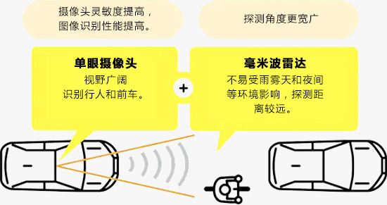 借助毫米波雷达和单眼摄像头,探测前方车辆和行人(昼夜)、骑行者(昼夜)、二轮机动车(昼间)。