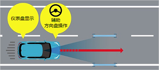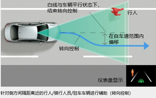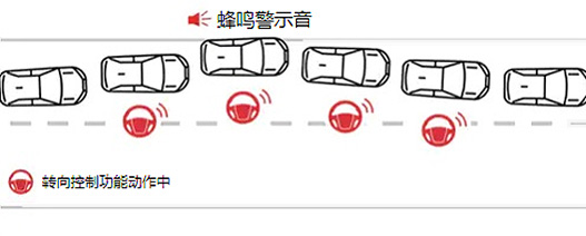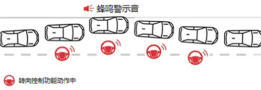 通过蜂鸣声和仪表盘显示作出提示,同时转向控制功能启动,辅助方向盘操作,避免越过白(黄)线。