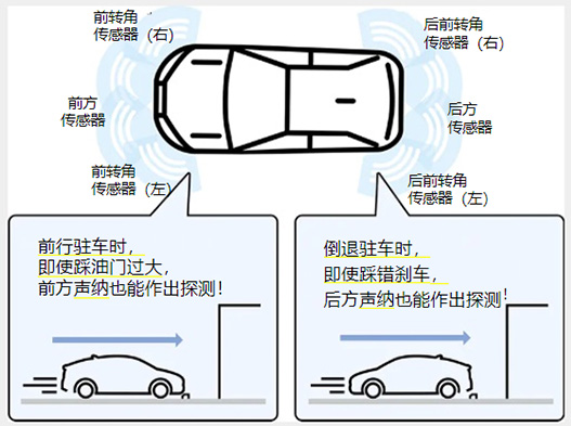 通过车身前后共8个传感器探测障碍物,在踩错油门或刹车时,作出自动紧急制动来减轻碰撞伤害。