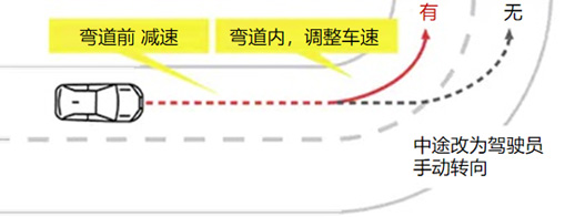 使用雷达巡航控制系统行驶过程中,当遇到弯道系统判断需要介入时,在开始转向时启动车速控制功能,同时在多功能信息显示屏上提示驾驶员系统正在动作。
