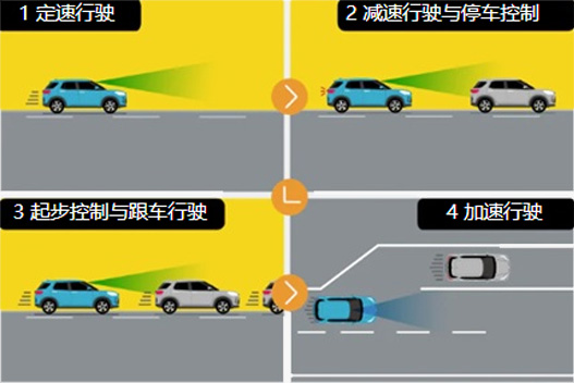 可以探测与前车距离,自动调节车速,保持合理车距;无前车时,保持设定速度行驶。