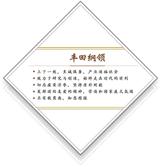 为了您的微笑,超越您的期待。 提供安全放心、令人心动的驾乘感受,创造全球美好生活与富裕社会,这是我们在未来社会中领跑移动工具领域的愿望。 为此,每一个丰田人都在打造高品质,都在时刻追求领先于时代的创新技术,都秉持与地球环境友好相处的意识、我们坚信,这是一个总是超越顾客期待、为顾客和所在地区创造快乐与幸福的丰田。 在坚持“精益求精”和永无止境的改善精神的同时我们还将倾听来自支持丰田发展的顾客的心声,锐意革新,实现更高更远的目标。