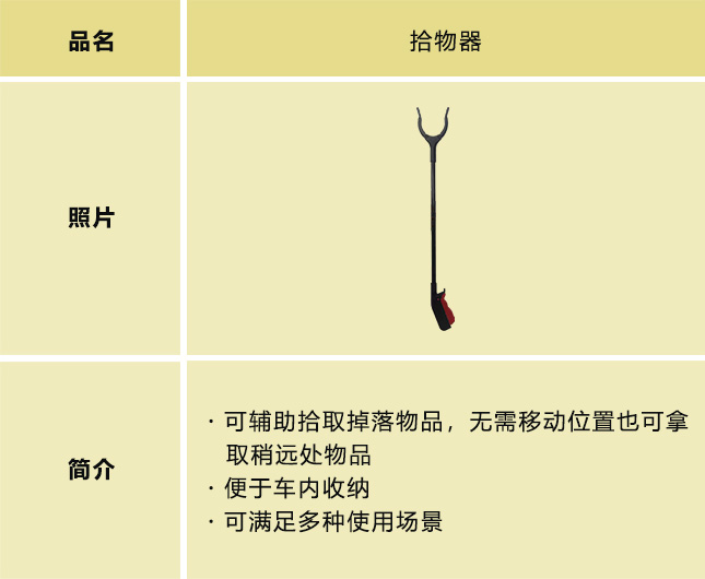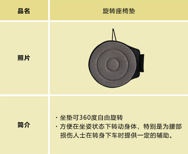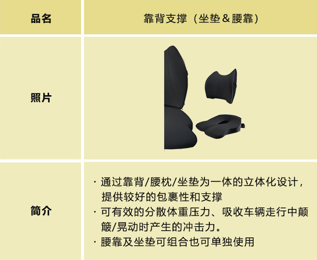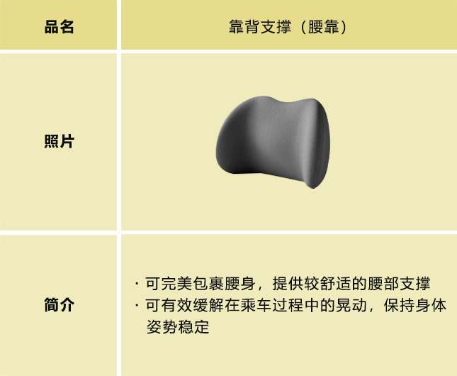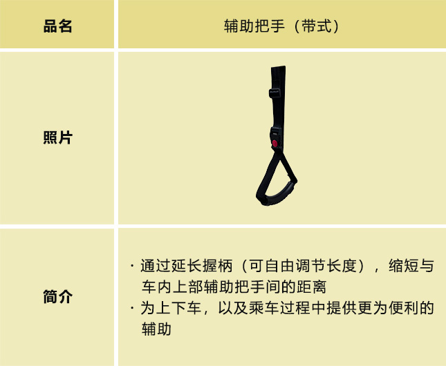 行动不便的人士也能安心便捷出行的辅助用品。为解决行动不便人群的出行烦恼,提高驾乘舒适感,方便更轻松地上下车,我们在听取各相关机构及人群意见及建议的基础上,开发了能够提升乘车舒适性(靠背支撑)和上下车便捷性(辅助把手/旋转座椅垫)等的出行辅助用品。今后也将持续推出新产品。