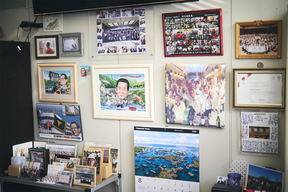 河合老师傅的办公室里有着数不清的照片和纪念品。