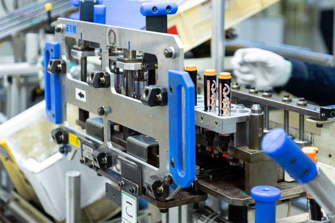 上图为在SS生产线上运用的一个装置:在组装名为“弹簧垫片”的小型圆盘状零件时,会用第一张图中央的笔头对垫片进行着色标记。这项设计显著提升了在检查装配质量时的视觉辨识度,确保组装准确无误。