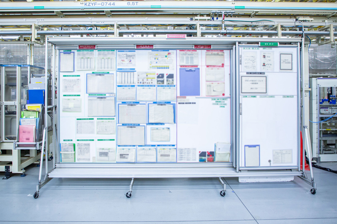 在工厂的各个小组设置有“组长管理板”,用于将公司方针和工厂长方针落实到一线的具体活动中进行管理。管理板上展示了三大主轴活动的具体内容,例如作业改善计划、设备停机时间等进展状况和课题。组长和成员通过查看该管理板来掌握目标的达成与否。