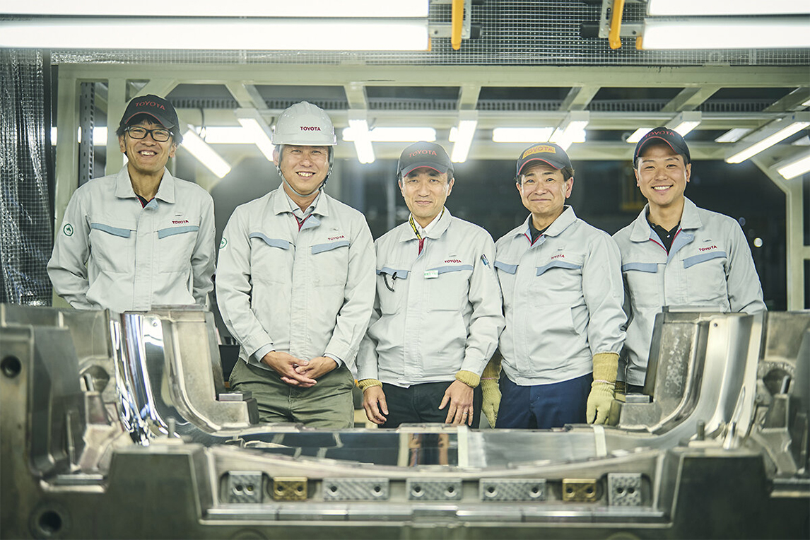 上图中团队成员们站在免涂装后杠下体专用模具后,展露出笑容。从左至右:加藤与竹下的上司嶋方克好、四处寻找模具钢材的新田翼、负责模具设计的丰田敏彦,以及加藤与竹下。