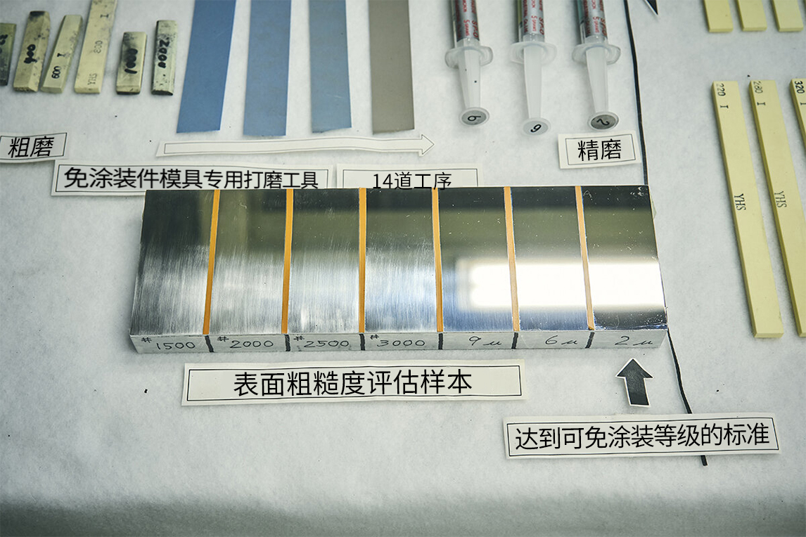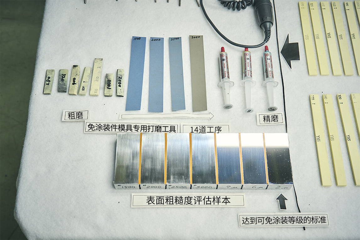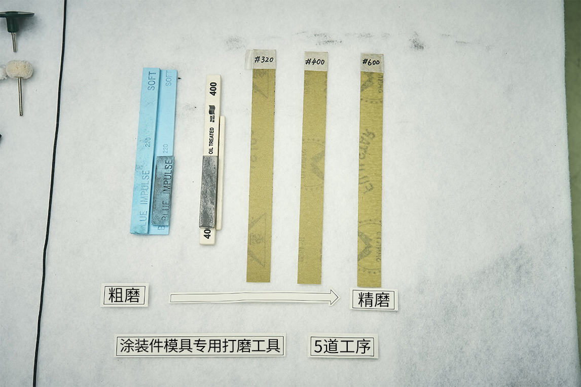 常规的涂装件模具会使用油石、砂纸等5种工具,通过5道工序研磨完成。而免涂装件用的模具最终会需要7种磨石、4种砂纸、3种研磨用金刚石研磨膏,通过14道工序研磨完成。