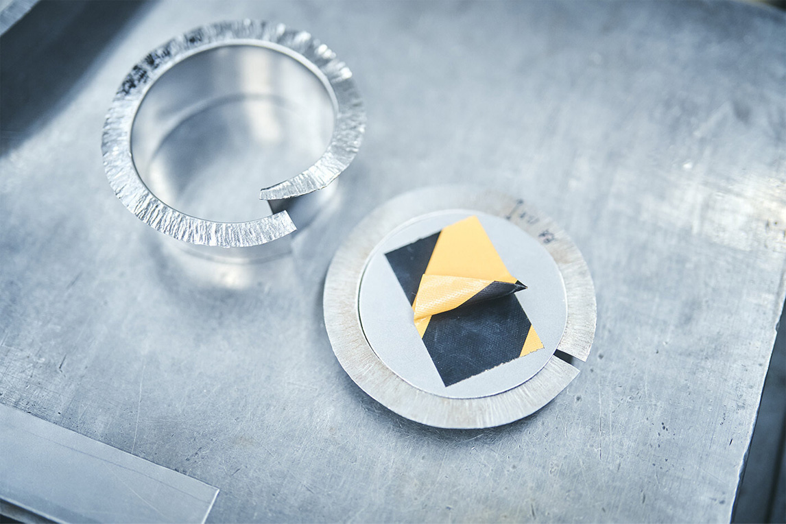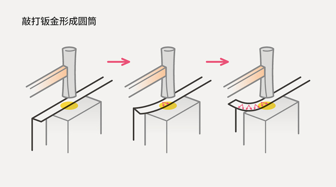 敲打L形铁板弯折处的边缘,该部分就会发生延展,产生V字型的变形。通过持续且均匀地制造出这种变形,整块铁板便会逐渐转变为圆形,最终形成圆筒。如果这项钣金作业无法均匀完成,就无法做出正圆。