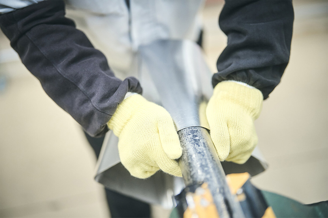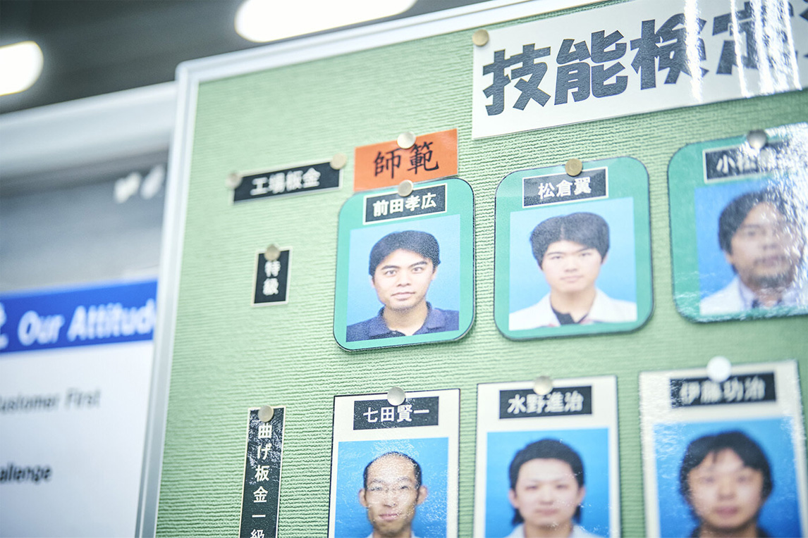 前田如今所具备的技能,是在长达26年的实务经验与技能奥运大赛特别训练中磨炼而成的。其高超的技艺,即便在基础加工中也展现得淋漓尽致。他曾进行了一项将L形铁板用锤子敲打加工成圆筒状的作业,这是新员工培训中的一个课题。在接受采访时,他与弟子一起为采访团队现场演示了这一过程。