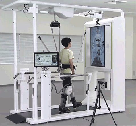 通常的行走训练需用支架固定住患者的膝盖和脚踝,并由理疗师在后方辅助支撑拥有数十公斤体重的患者行走。理疗师仅辅助患者行走就已经竭尽全力了。