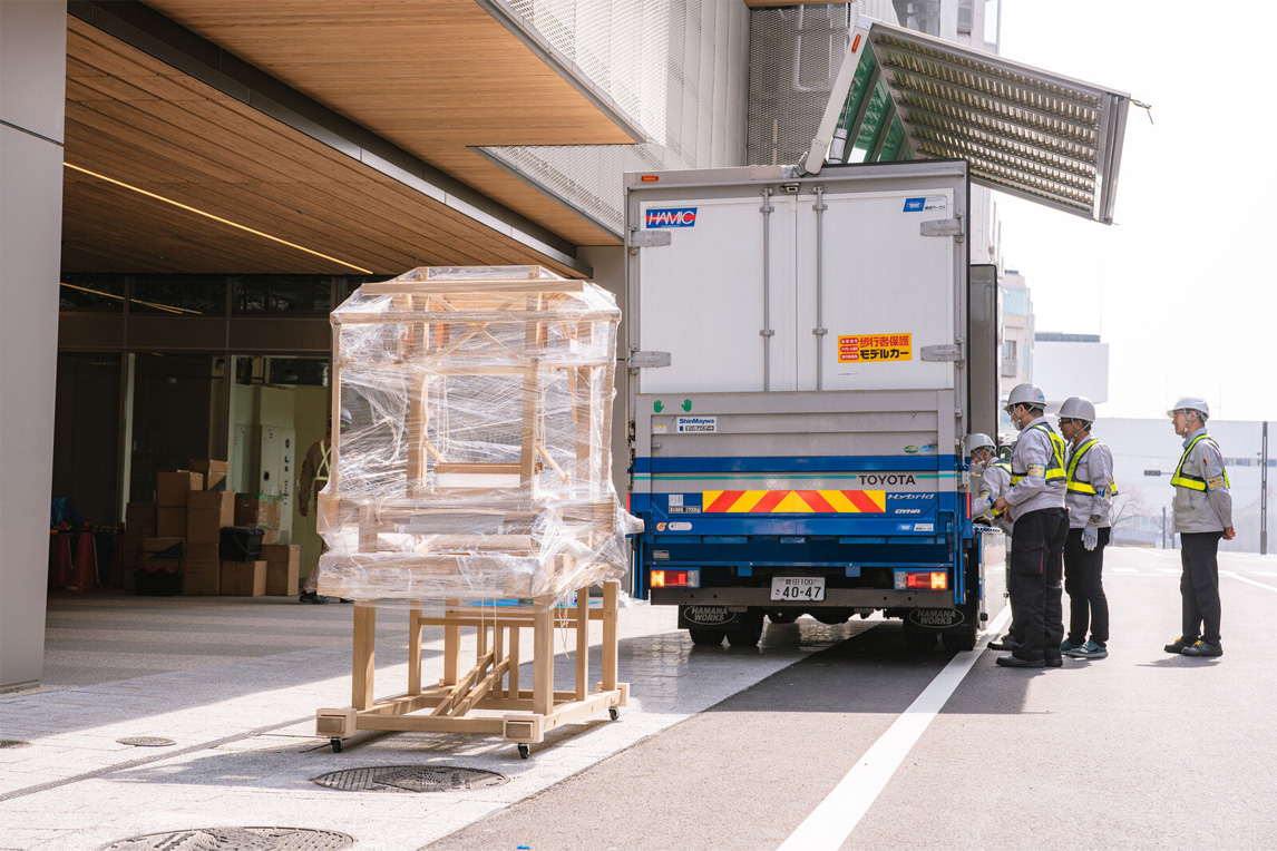 5位男性工作人员小心翼翼地从车厢中卸下一台木质织机。这辆货车上午8点,从爱知县三好市的丰田明知工厂出发,历经5个小时的精心护送终于到达了目的地。