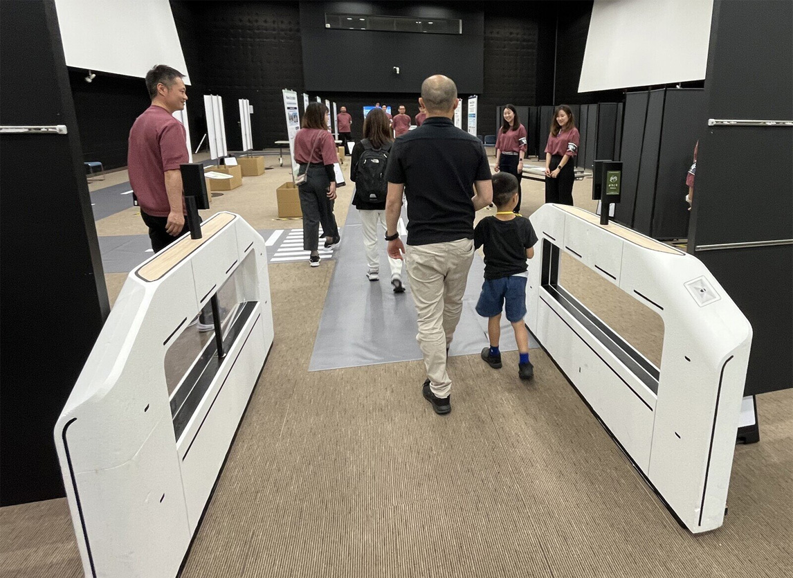 参与者穿过上期报道中介绍过的Woven City Welcome Center入口处的闸机模型,即可进入体验会场。与布置了草坪的说明会会场不同,这里的动线设计模拟了城市道路,打造出了一个微型的“移动性的测试场”。