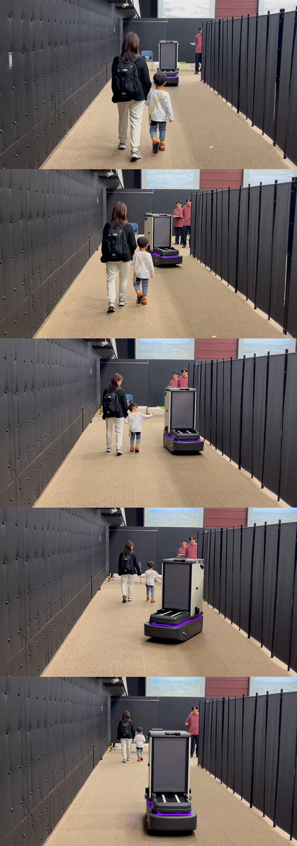 首先是“机器人避让体验”环节,在模拟了Woven City居住区走廊宽度的通道里,搬运机器人能够检测到有行人通过并自动避让。