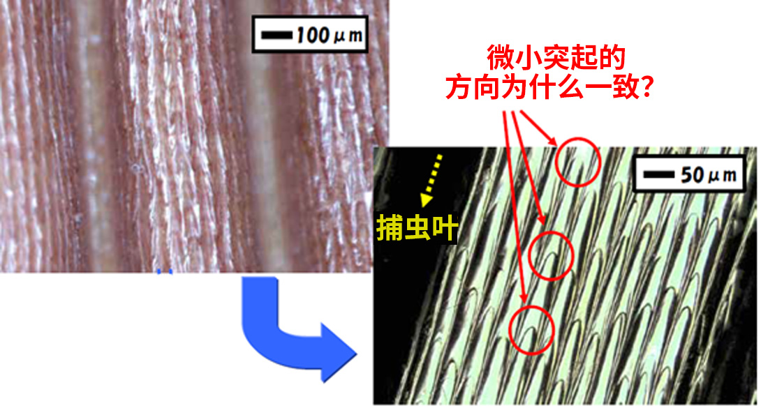 我们注意到,昆虫会落在猪笼草的唇部并滑落进叶片,而这个唇部的结构非常精细。