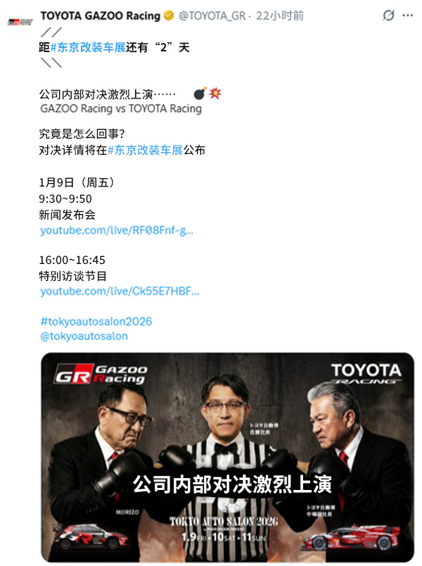 原本,TOYOTA GAZOO Racing(TGR)也会为大家带来激动人心的展示,然而就在展会开始两天前,其官方社媒账号上却发布了一条堪称“火药味十足”的预告。