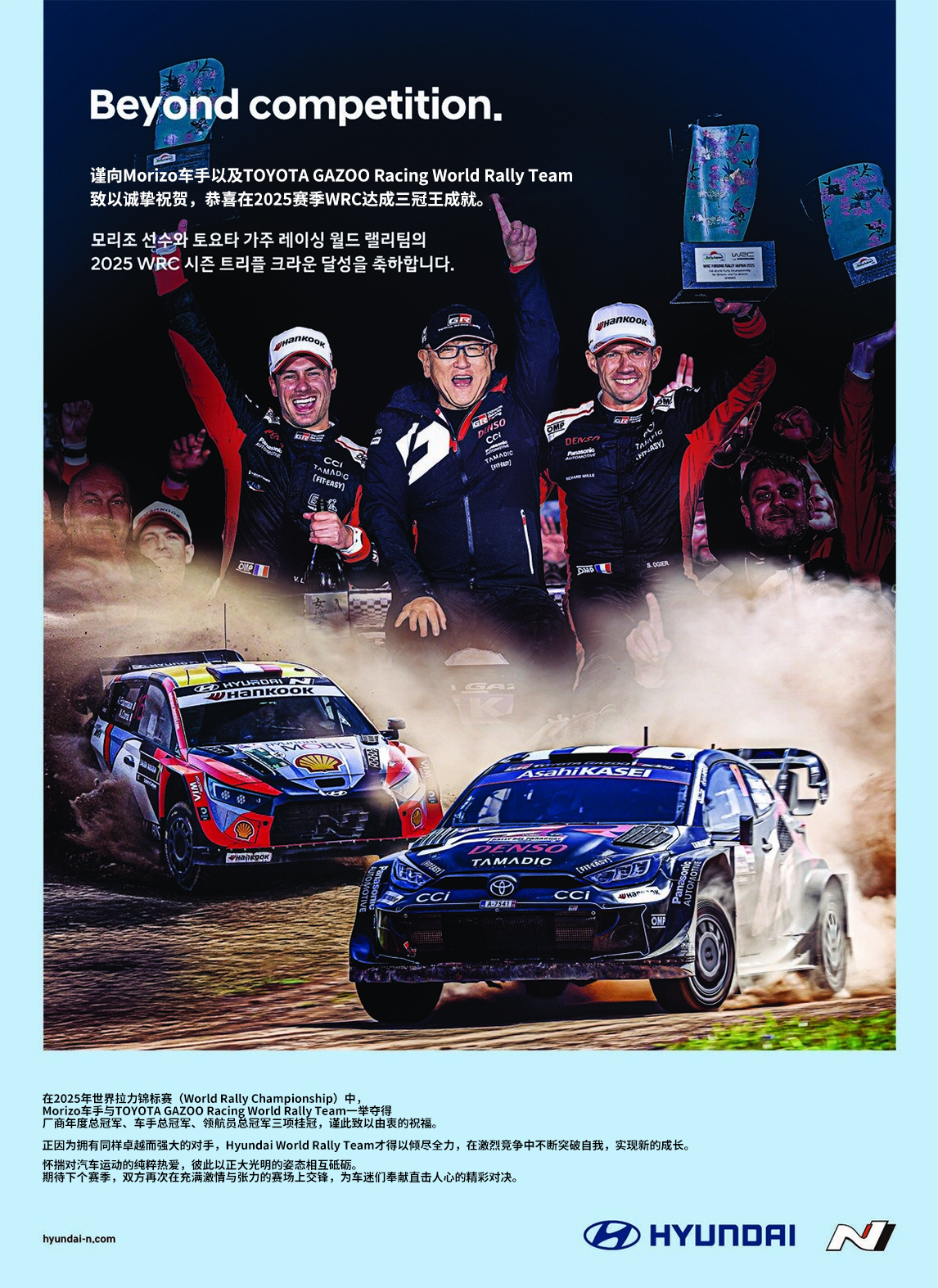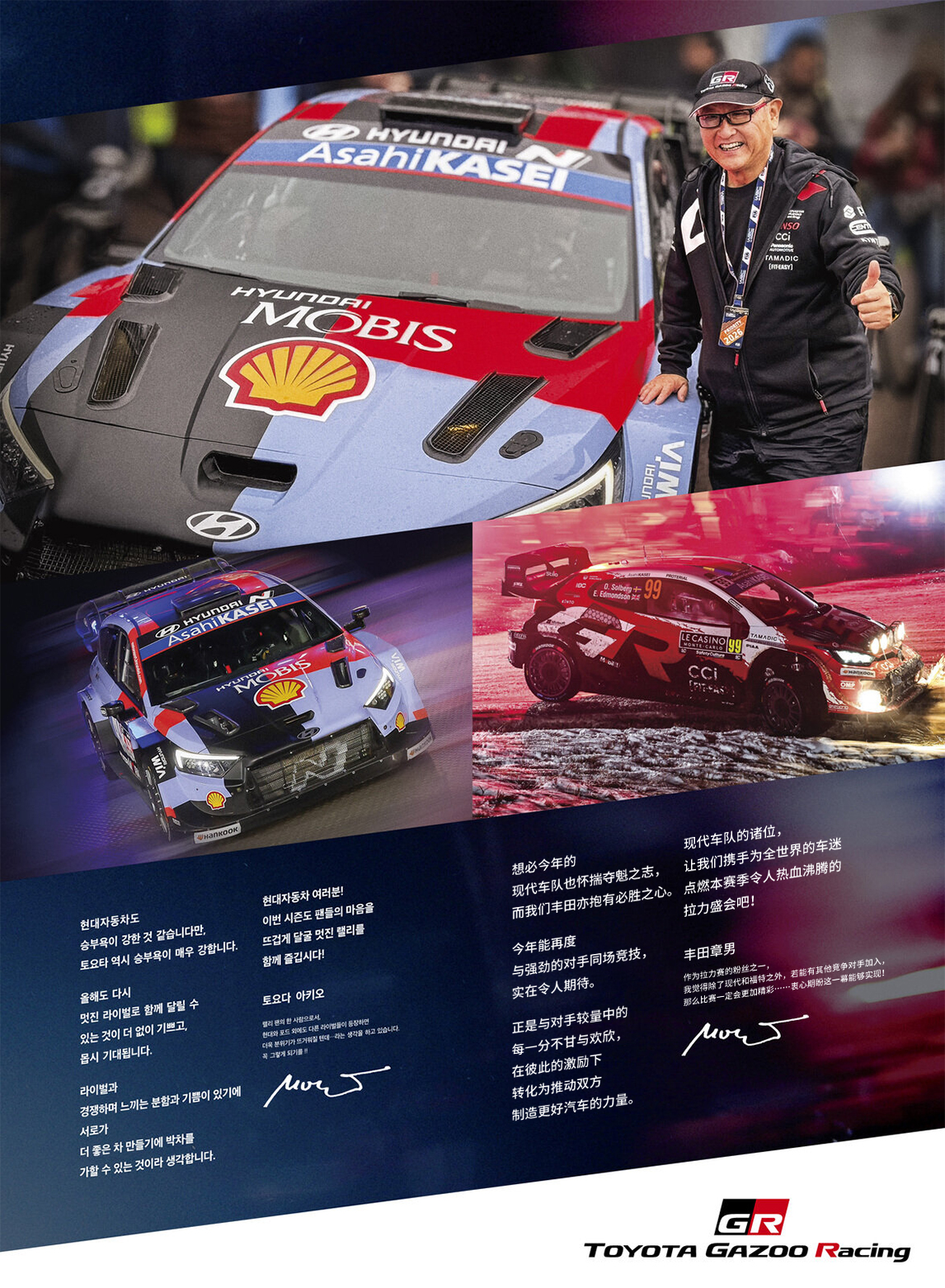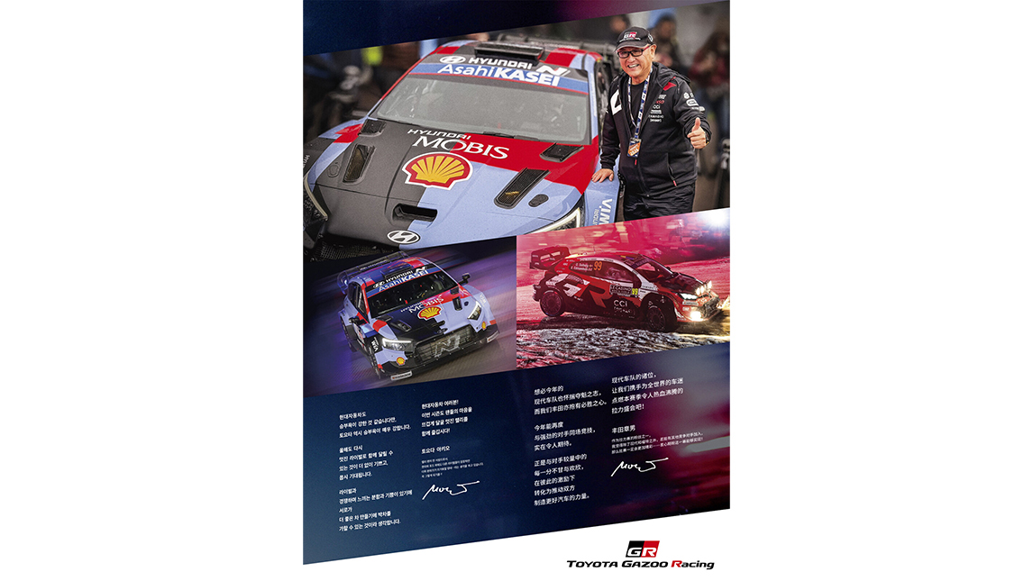 其实,从2024年开始,两家公司就通过报纸广告互相为对方加油鼓劲。在争夺厂商年度冠军的最后一赛——日本拉力锦标赛结束后的第二天,Morizo便向郑义宣会长及现代汽车的各位传达了这样的信息。