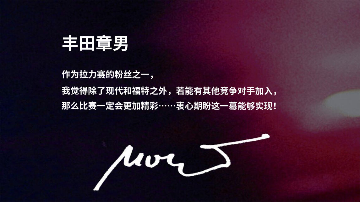 在“丰田章男”与“Morizo”两个名字之间,悄然夹着一行几乎不易察觉的“真意”。怀抱对汽车的热爱,投身于制造移动出行未来的事业——对于新的对手、新的挑战者,Morizo同样满怀期待,静候其登场。