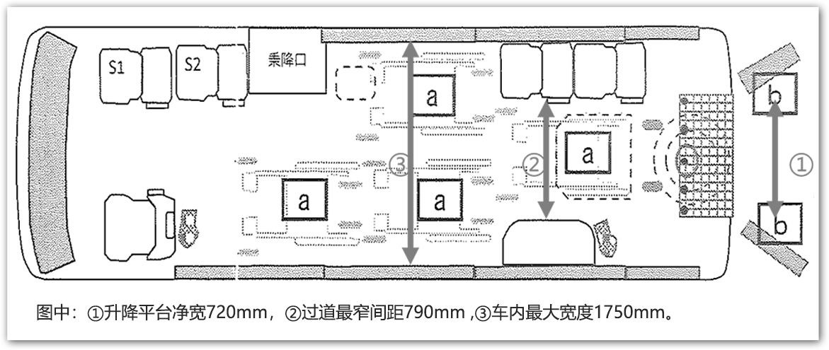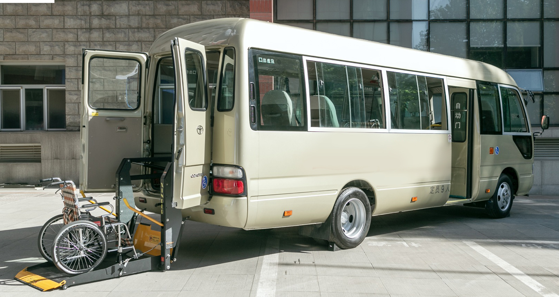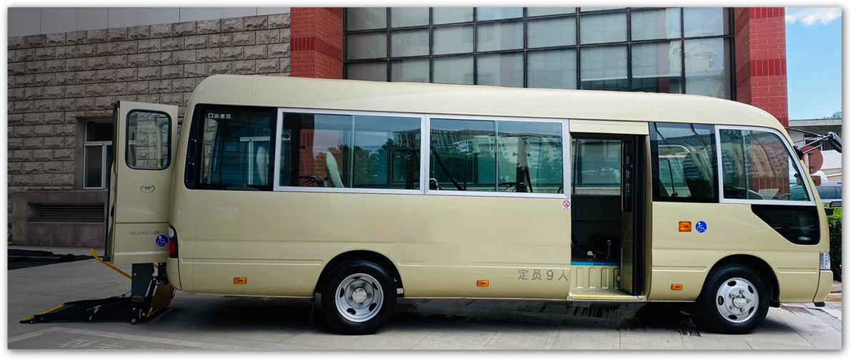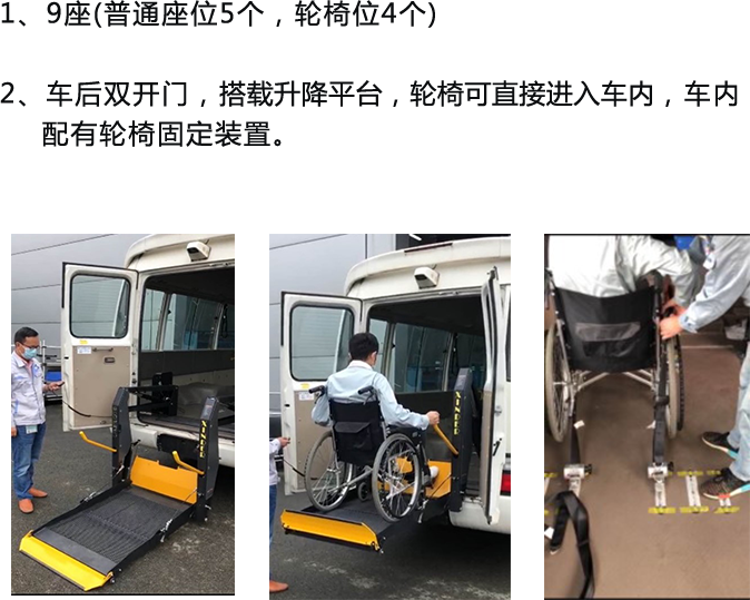 9座中型客车,最大可容纳4位轮椅使用者同时乘车,其余5个座位为常规座椅。