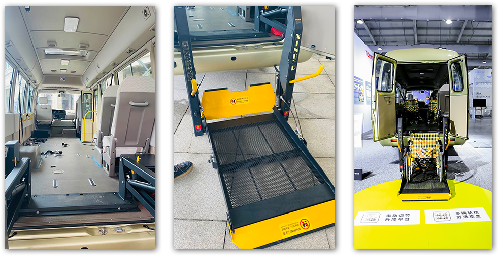 车尾部为双开门,配有带遥控器的电动升降平台(最大承重250kg),轮椅使用者不必离开轮椅,即可直接乘车。