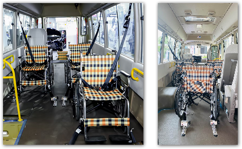 车内每台轮椅同时配备4个安全固定卡扣,以及3点式安全带及1个扶手,使乘车人即便坐在轮椅上,也可以安全并安心乘车。