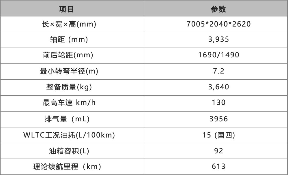 搭载V型六缸四冲程水冷汽油机,排气量4.0L,5速手动挡。